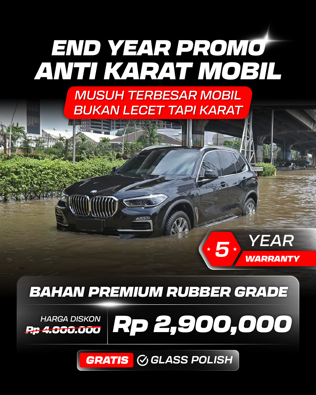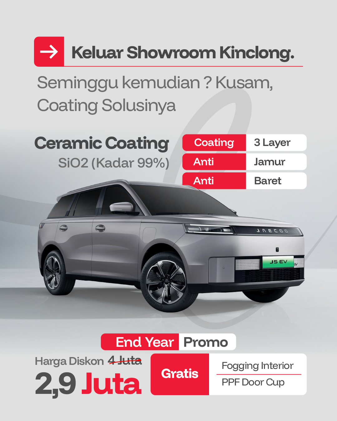 Coating bahan super ceramic 9H+ (SiO2, kadar 99%) kualitas terbaik karena bening tipis tetapi keras, 3x lebih kuat daripada bahan ceramic biasa lainnya, efek kilap dengan jangka waktu lebih lama.