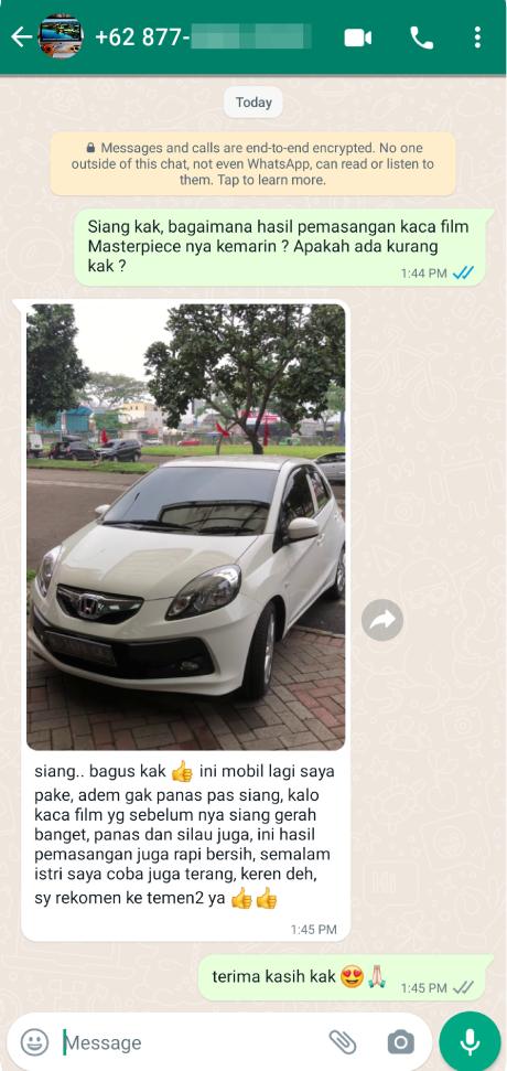 Kaca film MASTERPIECE dapat menolak panas dengan maksimal, menolak UV hingga 99% (UV400), mempunyai Drive Night Vision Techology, pandangan jernih (tidak bias), gelap dari luar (waktu siang hari) terang dari dalam (waktu malam hari), tidak mengganggu sinyal handphone dan GPS