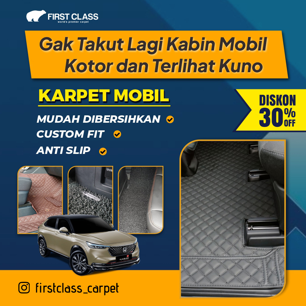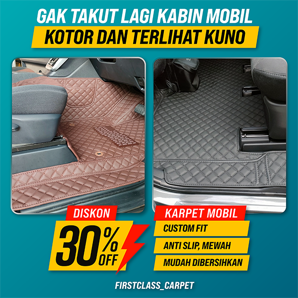 Karpet FIRST CLASS tipe VVIP dengan bahan microfiber leather di design khusus untuk setiap mobil dengan hasil ukuran yang sangat fit, presisi dan mewah, menutup semua bagian lantai mobil termasuk dinding samping sehingga kotoran / pasir / tanah semua nya tertampung di permukaan karpet dan sangat mudah untuk dibersihkan.